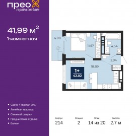 Продается однокомнатная квартира от застройщика с предчистовой отделкой в ЖК "Прео" на 14 этаже. Общая площадь: 41.99 кв.м., жилая: 11.57 кв.м., площадь просторной кухни-столовой: 18.89 кв.м. Все окна выходят на одну сторону. В квартире один балкон, один совмещенный санузел. Высота...