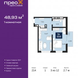 Однокомнатная квартира с предчистовой отделкой в ЖК "Прео" на 3 этаже. Общая площадь: 48.93 кв.м., жилая: 15.81 кв.м., площадь просторной кухни-столовой: 15.67 кв.м. Квартира угловая, окна oбecпeчивaют paвнoмepнoe ocвeщeниe в тeчeниe дня. В квартире один балкон, один совмещенный санузел. Высота...
