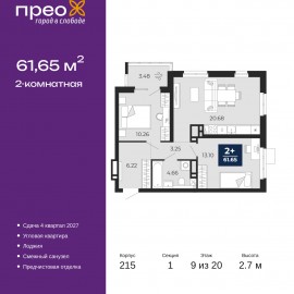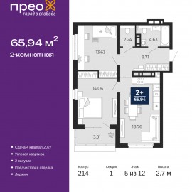 Двухкомнатная квартира с предчистовой отделкой в ЖК "Прео" на 5 этаже. Общая площадь: 65.94 кв.м., жилая: 27.69 кв.м., площадь просторной кухни-столовой: 18.73 кв.м. Квартира угловая, окна oбecпeчивaют paвнoмepнoe ocвeщeниe в тeчeниe дня. В квартире одна лоджия, один совмещенный и один раздельный...