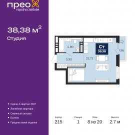1-комн. квартира-студия от застройщика с предчистовой отделкой в ЖК "Прео" на 8 этаже. Общая площадь: 38.38 кв.м., площадь гостиной 25.72 кв.м., из которых 5 кв.м. выделено под кухонную зону. Все окна выходят на одну сторону. В квартире один балкон, один совмещенный санузел. Высота...
