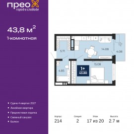 Однокомнатная квартира от застройщика с предчистовой отделкой в ЖК "Прео" на 17 этаже. Общая площадь: 43.8 кв.м., жилая: 15.08 кв.м., площадь просторной кухни-столовой: 14.08 кв.м. Все окна выходят на одну сторону. В квартире один балкон, один совмещенный санузел. Высота потолков 2.7 м....