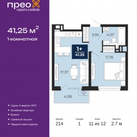 1-комн. квартира от застройщика с предчистовой отделкой в ЖК "Прео" на 11 этаже. Общая площадь: 41.25 кв.м., жилая: 11.78 кв.м., площадь просторной кухни-столовой: 17.37 кв.м. Все окна выходят на одну сторону. В квартире один балкон, один совмещенный санузел. Высота потолков 2.7 м. Дом...