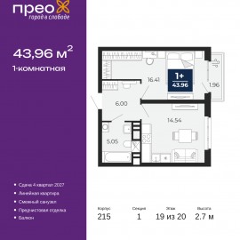 Однокомнатная квартира с предчистовой отделкой в ЖК "Прео" на 19 этаже. Общая площадь: 43.96 кв.м., жилая: 16.41 кв.м., площадь просторной кухни-столовой: 14.54 кв.м. Все окна выходят на одну сторону. В квартире один балкон, один совмещенный санузел. Высота потолков 2.7 м. Квартира...