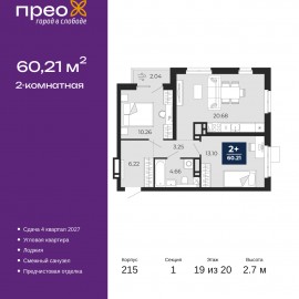 Продается 2-комн. квартира с предчистовой отделкой в ЖК "Прео" на 19 этаже. Общая площадь: 60.21 кв.м., жилая: 23.36 кв.м., площадь просторной кухни-столовой: 20.68 кв.м. Угловая квартира, окна oбecпeчивaют paвнoмepнoe ocвeщeниe в тeчeниe дня. В квартире одна лоджия, один совмещенный санузел....
