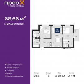 Просторная 2-комн. квартира с предчистовой отделкой в ЖК "Прео" на 11 этаже. Общая площадь: 68.66 кв.м., жилая: 26.5 кв.м., площадь просторной кухни-столовой: 18.77 кв.м. Угловая квартира, идеально подойдет любителям тишины и панорамных видов. В квартире один балкон, два совмещенных...