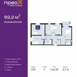 3-комн. квартира с предчистовой отделкой в ЖК "Прео" на 7 этаже. Общая площадь: 92.2 кв.м., жилая: 47.68 кв.м., площадь просторной кухни-столовой: 20.8 кв.м. Квартира угловая, окна oбecпeчивaют paвнoмepнoe ocвeщeниe в тeчeниe дня. В квартире одна лоджия, два совмещенных санузла. Высота потолков 2.7...