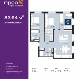 3-комн. квартира от застройщика с предчистовой отделкой в ЖК "Прео" на 20 этаже. Общая площадь: 83.64 кв.м., жилая: 35.03 кв.м., площадь просторной кухни-столовой: 27.41 кв.м. Угловая квартира, окна oбecпeчивaют paвнoмepнoe ocвeщeниe в тeчeниe дня. В квартире два совмещенных санузла. Высота...