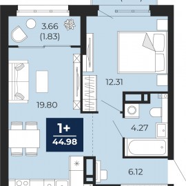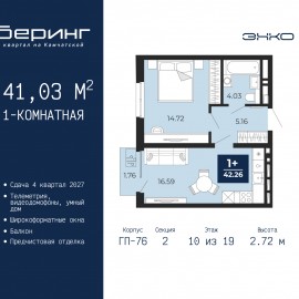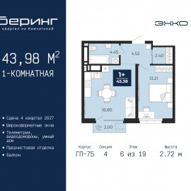 1-комн. квартира в ЖК "Беринг" на 3 этаже. Общая площадь: 44.98 кв.м. Высота потолков 2.75 м. Дом монолитный, многоподъездный, переменной этажности, от 9 до 22 этажей. Квартира находится в 73.3-й секции высотой 16 этажей в корпусе ГП-73. На этаже 8 квартир. В подъезде 1 пассажирский и 1...