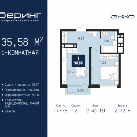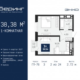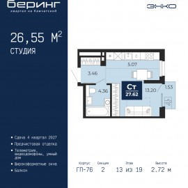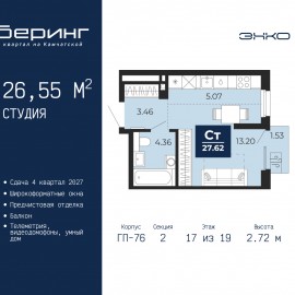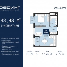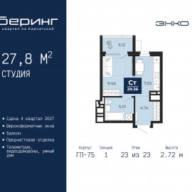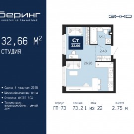 1-комн. квартира-студия от застройщика с предчистовой отделкой в ЖК "Беринг" на 6 этаже. Общая площадь: 34.74 кв.м., площадь гостиной 25.22 кв.м., из которых 5 кв.м. выделено под кухонную зону. Все окна выходят на одну сторону. В квартире один балкон, один совмещенный санузел. Высота...