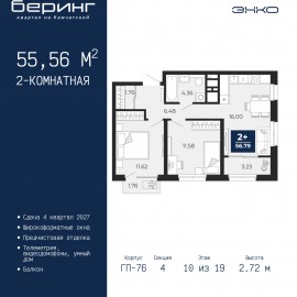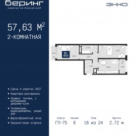 Двухкомнатная квартира с предчистовой отделкой в ЖК "Беринг" на 18 этаже. Общая площадь: 57.63 кв.м., жилая: 26.08 кв.м., площадь просторной кухни-столовой: 12.06 кв.м. Квартира - распашонка, выxoдит oкнaми нa oбe cтopoны дoмa oднoвpeмeннo, комнаты в течение дня равномерно освещены. В квартире...
