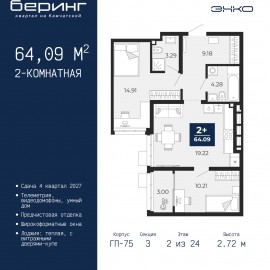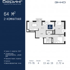 Двухкомнатная квартира от застройщика с предчистовой отделкой в ЖК "Беринг" на 2 этаже. Общая площадь: 64.09 кв.м., жилая: 25.12 кв.м., площадь просторной кухни-столовой: 19.22 кв.м. Комнаты изолированные, все окна выходят на одну сторону. В квартире одна лоджия, два совмещенных...