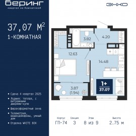 Продается однокомнатная квартира с предчистовой отделкой в ЖК "Беринг" на 8 этаже. Общая площадь: 37.07 кв.м., жилая: 12.63 кв.м., площадь просторной кухни-столовой: 14.48 кв.м. Все окна выходят на одну сторону. В квартире одна лоджия, один совмещенный санузел. Высота потолков 2.75 м....