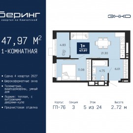 1-комн. квартира с предчистовой отделкой в ЖК "Беринг" на 5 этаже. Общая площадь: 47.97 кв.м., жилая: 11.08 кв.м., площадь просторной кухни-столовой: 21.3 кв.м. Все окна выходят на одну сторону. В квартире одна лоджия, один совмещенный санузел. Высота потолков 2.72 м. Дом монолитный,...