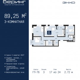3-комн. квартира от застройщика с предчистовой отделкой в ЖК "Беринг" на 17 этаже. Общая площадь: 89.25 кв.м., жилая: 38.27 кв.м., площадь просторной кухни-столовой: 24.27 кв.м. Угловая квартира, очень светлая, естественная вентиляция при открытии окон. В квартире один балкон и одна...