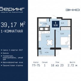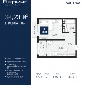 Продается 1-комн. квартира от застройщика с предчистовой отделкой в ЖК "Беринг" на 8 этаже. Общая площадь: 39.23 кв.м., жилая: 9.08 кв.м., площадь просторной кухни-столовой: 15.29 кв.м. Все окна выходят на одну сторону. В квартире один балкон и одна лоджия, один совмещенный санузел....