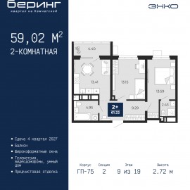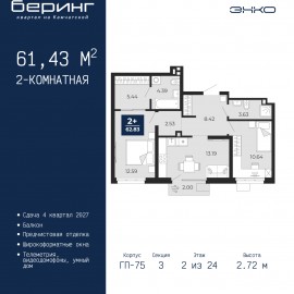 Просторная 2-комн. квартира с предчистовой отделкой в ЖК "Беринг" на 2 этаже. Общая площадь: 61.43 кв.м., жилая: 23.23 кв.м., площадь просторной кухни-столовой: 13.19 кв.м. Комнаты изолированные, все окна выходят на одну сторону. В квартире один балкон, два совмещенных санузла. Высота...