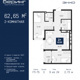 2-комн. квартира от застройщика с предчистовой отделкой в ЖК "Беринг" на 9 этаже. Общая площадь: 62.65 кв.м., жилая: 25.12 кв.м., площадь просторной кухни-столовой: 18.32 кв.м. Комнаты изолированные, все окна выходят на одну сторону. В квартире одна лоджия, два совмещенных санузла. Высота...