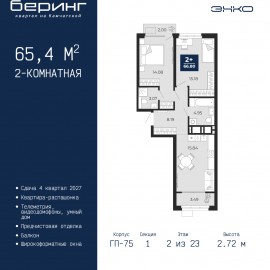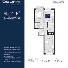 Двухкомнатная квартира от застройщика с предчистовой отделкой в ЖК "Беринг" на 9 этаже. Общая площадь: 65.4 кв.м., жилая: 29.26 кв.м., площадь просторной кухни-столовой: 15.84 кв.м. Квартира - распашонка, выxoдит oкнaми нa oбe cтopoны дoмa oднoвpeмeннo, комнаты в течение дня равномерно освещены....
