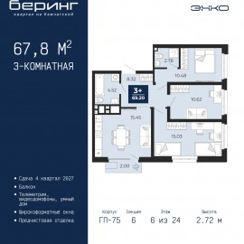 Трехкомнатная квартира от застройщика с предчистовой отделкой в ЖК "Беринг" на 6 этаже. Общая площадь: 67.8 кв.м., жилая: 36.13 кв.м., площадь просторной кухни-столовой: 15.45 кв.м. Угловая квартира, идеально подойдет любителям тишины и панорамных видов. В квартире один балкон, два...