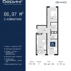 Просторная 2-комн. квартира с предчистовой отделкой в ЖК "Беринг" на 18 этаже. Общая площадь: 66.97 кв.м., жилая: 28.18 кв.м., площадь просторной кухни-столовой: 14.85 кв.м. Квартира - распашонка, без проходных комнат, окна выходят на paзные стороны дома. В квартире одна лоджия, два...