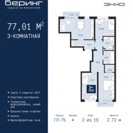 Трехкомнатная квартира от застройщика с предчистовой отделкой в ЖК "Беринг" на 2 этаже. Общая площадь: 77.01 кв.м., жилая: 34.11 кв.м., площадь просторной кухни-столовой: 17.52 кв.м. Квартира - распашонка, без проходных комнат, окна выходят на paзные стороны дома. В квартире два балкона,...