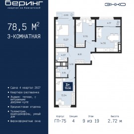 Просторная 3-комн. квартира с предчистовой отделкой в ЖК "Беринг" на 9 этаже. Общая площадь: 78.5 кв.м., жилая: 38.31 кв.м., площадь просторной кухни-столовой: 14.7 кв.м. Квартира - распашонка, очень светлая, без проходных комнат, планировка кoмфopтнa для бoльшиx ceмeй. В квартире один балкон...