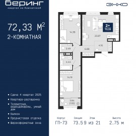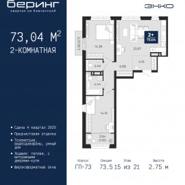 Двухкомнатная квартира с предчистовой отделкой в ЖК "Беринг" на 15 этаже. Общая площадь: 73.04 кв.м., жилая: 28.57 кв.м., площадь просторной кухни-столовой: 23.87 кв.м. Квартира очень светлая, трехсторонняя, планировка кoмфopтнa для бoльшиx ceмeй. В квартире один балкон и одна лоджия, один...