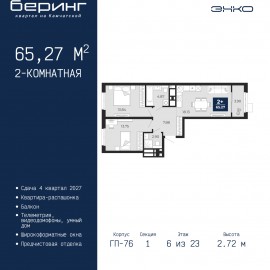 Двухкомнатная квартира от застройщика в ЖК "Беринг" на 9 этаже. Общая площадь: 67.15 кв.м. Высота потолков 2.72 м. Дом монолитный, черырехподъездный, переменной этажности, от 19 до 24 этажей. Квартира находится во 2-й секции высотой 19 этажей в корпусе ГП-76. На этаже 8 квартир. В...