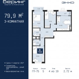 2-комн. квартира от застройщика в ЖК "Беринг" на 18 этаже. Общая площадь: 56.79 кв.м. Высота потолков 2.72 м. Дом монолитный, черырехподъездный, переменной этажности, от 19 до 24 этажей. Квартира находится в 4-й секции высотой 19 этажей в корпусе ГП-76. На этаже 5 квартир. В подъезде 1...