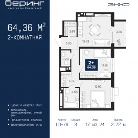 2-комн. квартира с предчистовой отделкой в ЖК "Беринг" на 17 этаже. Общая площадь: 56.36 кв.м., жилая: 22.22 кв.м., площадь просторной кухни-столовой: 19.37 кв.м. Комнаты изолированные, все окна выходят на одну сторону. В квартире один балкон, один совмещенный санузел. Высота потолков 2.72...