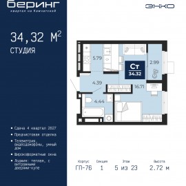 1-комн. квартира-студия с предчистовой отделкой в ЖК "Беринг" на 5 этаже. Общая площадь: 34.32 кв.м., площадь гостиной 22.5 кв.м., из которых 5.79 кв.м. выделено под кухонную зону. Все окна выходят на одну сторону. В квартире одна лоджия, один совмещенный санузел. Высота потолков 2.72 м....