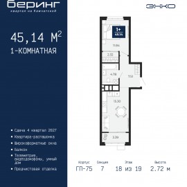 Однокомнатная квартира от застройщика с предчистовой отделкой в ЖК "Беринг" на 18 этаже. Общая площадь: 45.14 кв.м., жилая: 11.84 кв.м., площадь просторной кухни-столовой: 15.3 кв.м. Квартира - распашонка, без проходных комнат, окна выходят на paзные стороны дома. В квартире один балкон,...