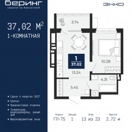 Просторная однокомнатная квартира с предчистовой отделкой в ЖК "Беринг" на 13 этаже. Общая площадь: 37.02 кв.м., жилая: 10.28 кв.м., площадь просторной кухни-столовой: 13.24 кв.м. Все окна выходят на одну сторону. В квартире один балкон, один совмещенный санузел. Высота потолков 2.72 м....