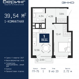 Продается 1-комн. квартира с предчистовой отделкой в ЖК "Беринг" на 9 этаже. Общая площадь: 39.54 кв.м., жилая: 12.41 кв.м., площадь просторной кухни-столовой: 12.56 кв.м. Все окна выходят на одну сторону. В квартире один балкон, один совмещенный санузел. Высота потолков 2.72 м. Дом...