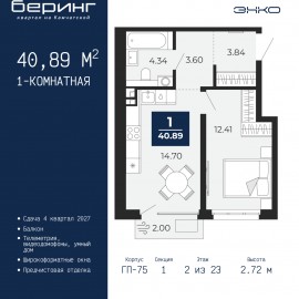 1-комн. квартира с предчистовой отделкой в ЖК "Беринг" на 2 этаже. Общая площадь: 40.89 кв.м., жилая: 12.41 кв.м., площадь просторной кухни-столовой: 14.7 кв.м. Все окна выходят на одну сторону. В квартире один балкон, один совмещенный санузел. Высота потолков 2.72 м. Дом монолитный,...