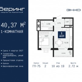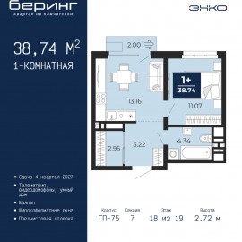 Просторная 1-комн. квартира с предчистовой отделкой в ЖК "Беринг" на 2 этаже. Общая площадь: 40.37 кв.м., жилая: 11.98 кв.м., площадь просторной кухни-столовой: 13.72 кв.м. Все окна выходят на одну сторону. В квартире один балкон, один совмещенный санузел. Высота потолков 2.72 м. Дом...