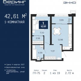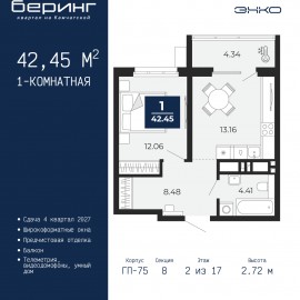 Однокомнатная квартира с предчистовой отделкой в ЖК "Беринг" на 2 этаже. Общая площадь: 42.45 кв.м., жилая: 12.06 кв.м., площадь просторной кухни-столовой: 13.16 кв.м. Все окна выходят на одну сторону. В квартире один балкон, один совмещенный санузел. Высота потолков 2.72 м. Дом...