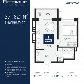 Просторная однокомнатная квартира с предчистовой отделкой в ЖК "Беринг" на 23 этаже. Общая площадь: 37.02 кв.м., жилая: 10.28 кв.м., площадь просторной кухни-столовой: 13.24 кв.м. Все окна выходят на одну сторону. В квартире один балкон, один совмещенный санузел. Высота потолков 2.72 м....