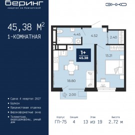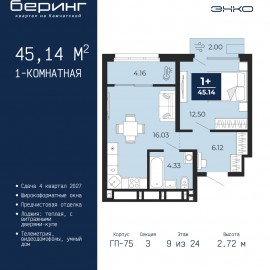 1-комн. квартира от застройщика с предчистовой отделкой в ЖК "Беринг" на 9 этаже. Общая площадь: 45.14 кв.м., жилая: 12.5 кв.м., площадь просторной кухни-столовой: 16.89 кв.м. Все окна выходят на одну сторону. В квартире один балкон и одна лоджия, один совмещенный санузел. Высота потолков...