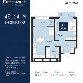 Продается однокомнатная квартира от застройщика с предчистовой отделкой в ЖК "Беринг" на 13 этаже. Общая площадь: 45.14 кв.м., жилая: 12.5 кв.м., площадь просторной кухни-столовой: 16.89 кв.м. Все окна выходят на одну сторону. В квартире один балкон и одна лоджия, один совмещенный...