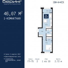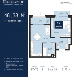 1-комн. квартира в ЖК "Беринг" на 2 этаже. Общая площадь: 46.38 кв.м. Высота потолков 2.72 м. Дом монолитный, многоподъездный, переменной этажности, от 17 до 24 этажей. Квартира находится в 3-й секции высотой 24 этажа в корпусе ГП-75. На этаже 6 квартир. В подъезде 2 пассажирских и 1...
