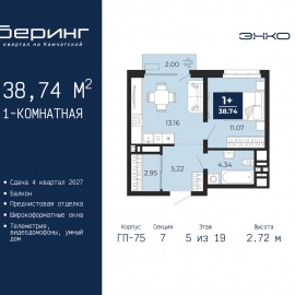 Продается 1-комн. квартира с предчистовой отделкой в ЖК "Беринг" на 5 этаже. Общая площадь: 38.74 кв.м., жилая: 11.07 кв.м., площадь просторной кухни-столовой: 13.16 кв.м. Все окна выходят на одну сторону. В квартире один балкон, один совмещенный санузел. Высота потолков 2.72 м. Дом...