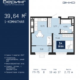 Просторная 1-комн. квартира с предчистовой отделкой в ЖК "Беринг" на 10 этаже. Общая площадь: 39.64 кв.м., жилая: 11.46 кв.м., площадь просторной кухни-столовой: 13.71 кв.м. Все окна выходят на одну сторону. В квартире одна лоджия, один совмещенный санузел. Высота потолков 2.72 м. Дом...