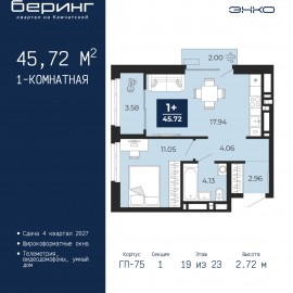 Продается однокомнатная квартира от застройщика с предчистовой отделкой в ЖК "Беринг" на 19 этаже. Общая площадь: 45.72 кв.м., жилая: 11.05 кв.м., площадь просторной кухни-столовой: 17.94 кв.м. Квартира угловая, идеально подойдет любителям тишины и панорамных видов. В квартире один...