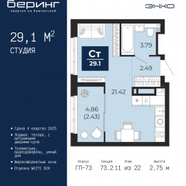 Продается 1-комн. квартира-студия с предчистовой отделкой в ЖК "Беринг" на 11 этаже. Общая площадь: 29.1 кв.м., площадь гостиной 21.42 кв.м., из которых 5 кв.м. выделено под кухонную зону. Все окна выходят на одну сторону. В квартире одна лоджия, один совмещенный санузел. Высота...