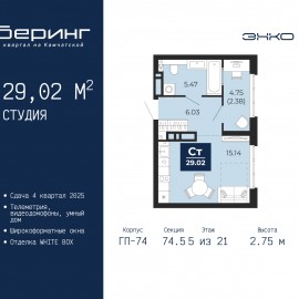 Просторная 1-комн. квартира-студия с предчистовой отделкой в ЖК "Беринг" на 5 этаже. Общая площадь: 29.02 кв.м., площадь гостиной 15.14 кв.м., из которых 5 кв.м. выделено под кухонную зону. Все окна выходят на одну сторону. В квартире один совмещенный санузел. Высота потолков 2.75 м. Дом...