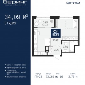 1-комн. квартира-студия от застройщика с предчистовой отделкой в ЖК "Беринг" на 6 этаже. Общая площадь: 34.09 кв.м., площадь гостиной 25.22 кв.м., из которых 5 кв.м. выделено под кухонную зону. Все окна выходят на одну сторону. В квартире один совмещенный санузел. Высота потолков 2.75 м....