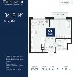 1-комн. квартира-студия с предчистовой отделкой в ЖК "Беринг" на 11 этаже. Общая площадь: 34.8 кв.м., площадь гостиной 25.22 кв.м., из которых 5 кв.м. выделено под кухонную зону. Все окна выходят на одну сторону. В квартире один балкон, один совмещенный санузел. Высота потолков 2.75 м....