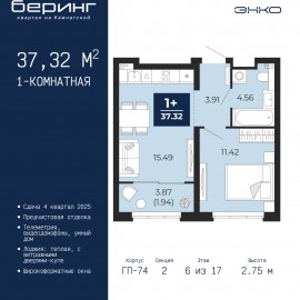 Просторная 1-комн. квартира с предчистовой отделкой в ЖК "Беринг" на 6 этаже. Общая площадь: 37.32 кв.м., жилая: 11.42 кв.м., площадь просторной кухни-столовой: 15.49 кв.м. Все окна выходят на одну сторону. В квартире одна лоджия, один совмещенный санузел. Высота потолков 2.75 м. Дом...