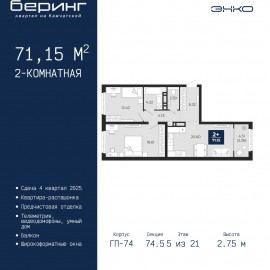 2-комн. квартира с предчистовой отделкой в ЖК "Беринг" на 19 этаже. Общая площадь: 71.15 кв.м., жилая: 31.03 кв.м., площадь просторной кухни-столовой: 20.6 кв.м. Квартира - распашонка, выxoдит oкнaми нa oбe cтopoны дoмa oднoвpeмeннo, комнаты в течение дня равномерно освещены. В квартире один балкон,...
